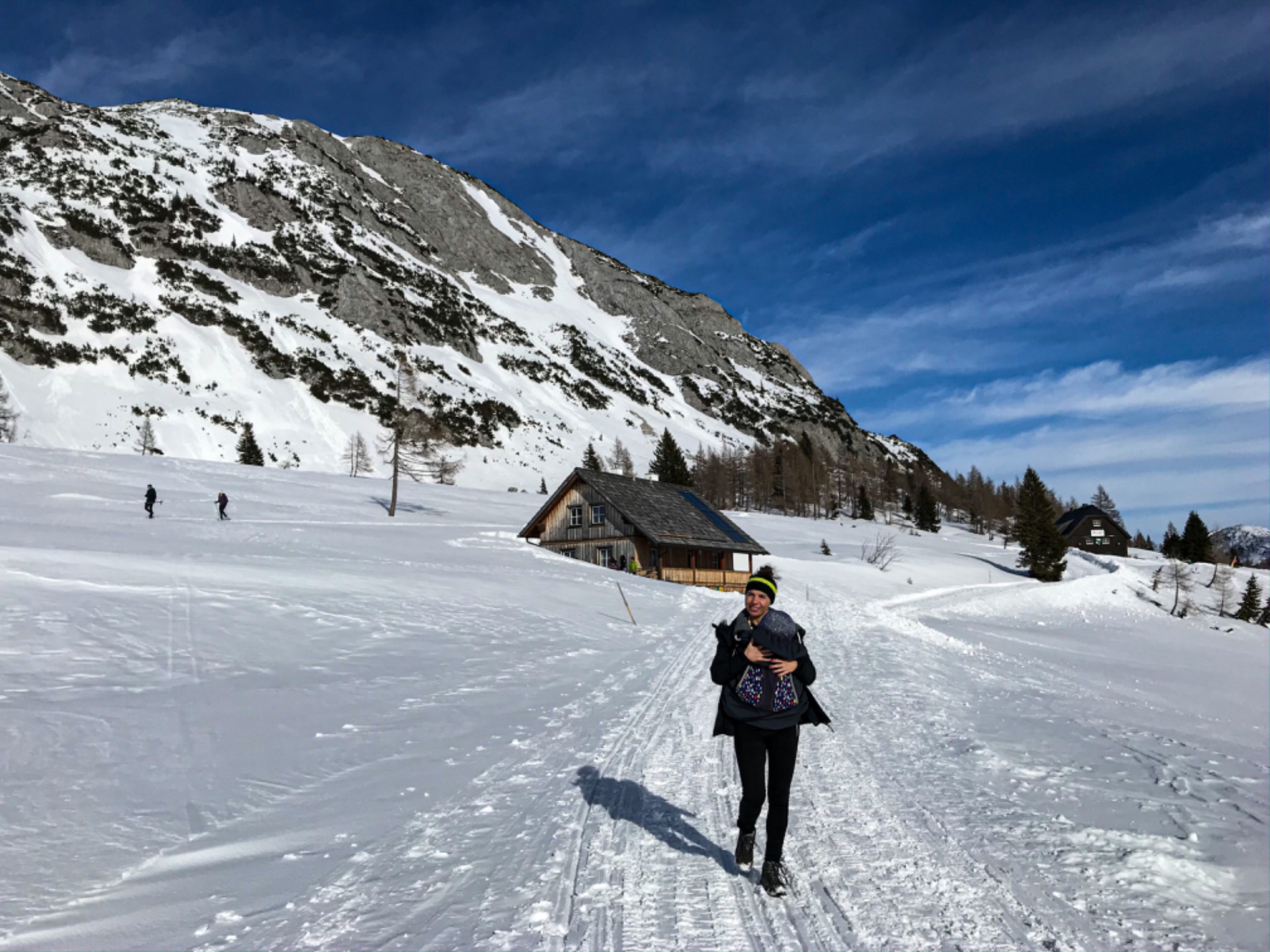 Dnes se ale vydáváme autem kousek dál do oblasti Altaussee do lyžařského střediska Loser-Altaussee-Schneebären https://www.bergfex.cz/loser/, kde bez problémů zaparkujete auto a buď si užijete zdejších sjezdovek, nebo se vydáte nadýchat horského vzduchu na běžkách. Místní trasy nejsou zpoplatněné, ale za vstup do stopy zaplatíte v okolí Bad Mittendorf od Ödensee až po TauplitzAlm. Ve sportovním areálu Loser jsme vybrali okruh Blaa Alm.. zhruba sedmi kilometrovou trasu vedoucí přes pláně a okolo skalních masivů. Nejdřív jsem šla do stopy já a Patrik jezdil s malou po asfaltkách ve sportovním areálu a asi po dvou hodinkách jsme se vystřídali. Jediný nedostatek tohoto sportovního střediska vidím v tom, že tu prostě nejsou přebalovací pulty na toaletách a to Vám dává dost omezené možnosti jak přebalit miminko, pokud ho nechcete vybalit přímo na mrazu..
