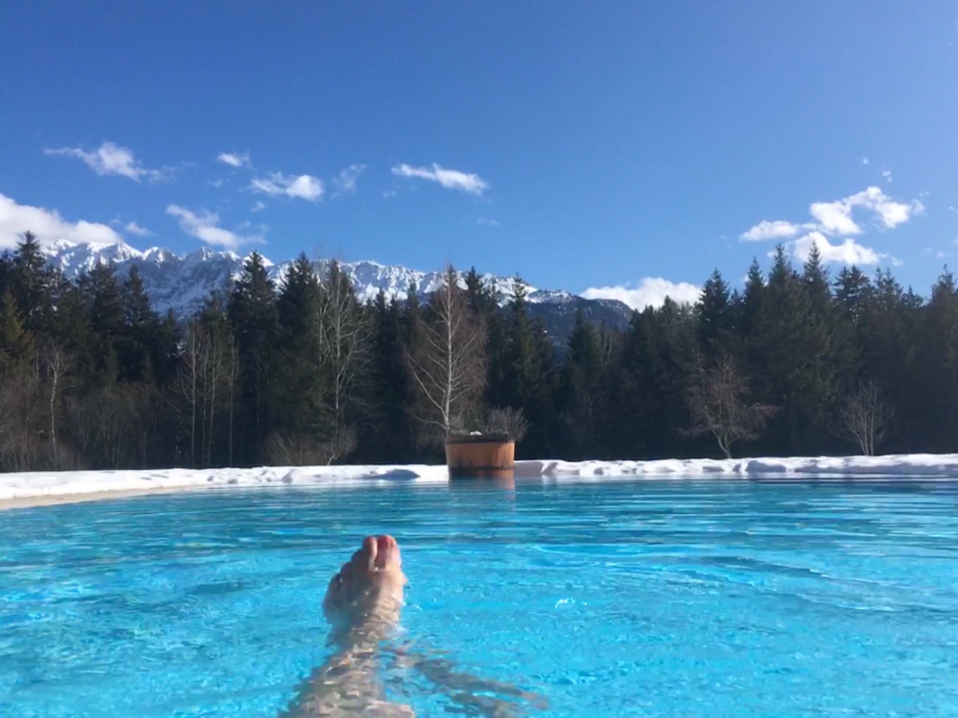 Příští den nemělo být moc hezké počasí a tak jsme se vydali vyzkoušet druhé místní lázně Grimming. Zde je pro změnu voda termální s množstvím minerálů. A co jsme si užili nejvíce, byl saunový svět se saunovými rituály každou hodinu. Skvělé bylo, že Vám při vstupu do místních lázní dají ochranné návleky na kolečka kočárku a tak si ho bez problémů můžete vzít s sebou dovnitř. V lázních Grimming je k dispozici také omezené množství plážových stanů, kde můžete dětem rozložit hračky, nebo v pohodlí nakojit miminko. A nakonec jsme měli i štěstí na krásný slunný den.. takže to přímo vybízelo jít ze sauny rovnou do sněhové závěje nebo do venkovního ochlazujícího bazénu.